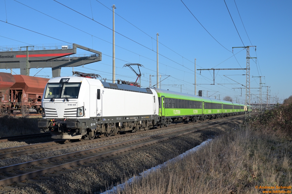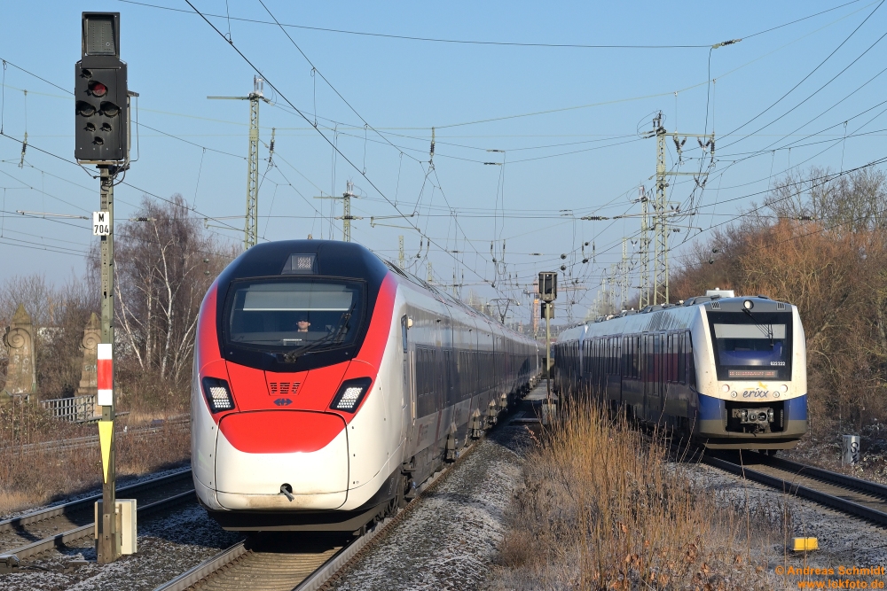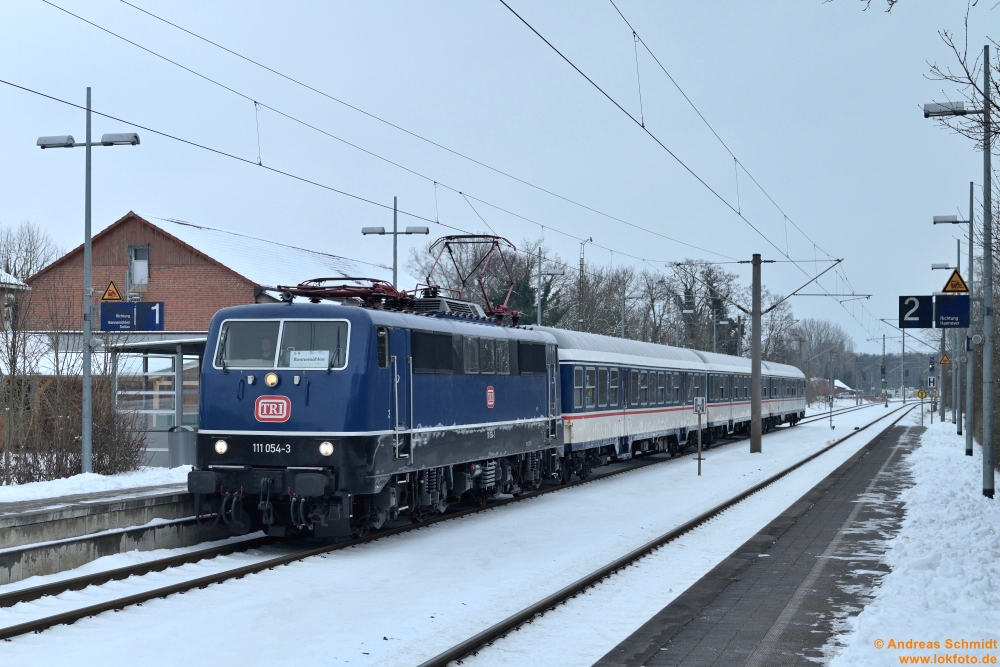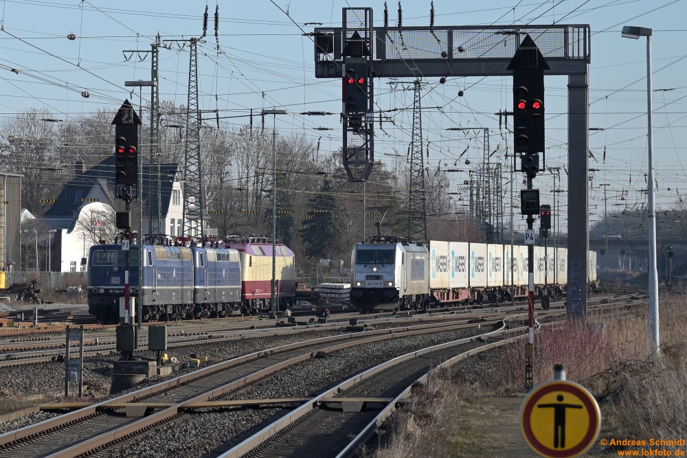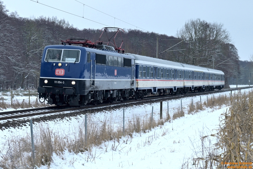 Wenn man sich mal Wolken wünscht, sind natürlich keine da und man steht da mit dem Gegenlicht: links 111 212 mit der TRI-n Wagen-Garnitur gen Hannover, rechts TRI 111 227 mit der nächsten Fahrt gen Bennemühlen (mit TRI-Dostos) - Mellendorf